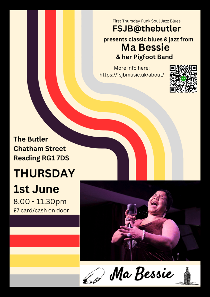 Julia Titus returned to her home town to play a very special performance of Ma Bessie at FSJB on Thursday 1st June. It was standing room only as the full house gave an enthusiastic reception to her soulful – (and naughty!) rendition of blues and jazz classics and some wonderful original songs written by Julia herself. She was accompanied by Matt Foster on guitar who made a sterling effort to keep up the pace (or slow down as requested by Julia!) due to a last minute op for percussionist Andy. Julia’s wonderful, deep voice filled the room – as did her humour and laid back style. With a gin in hand, she led the singing for some fun – and also moving, audience participation – what a great night!